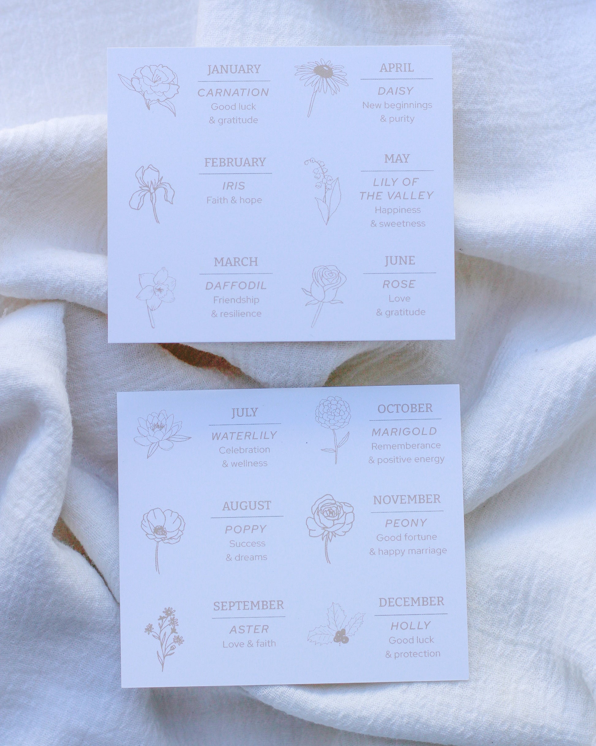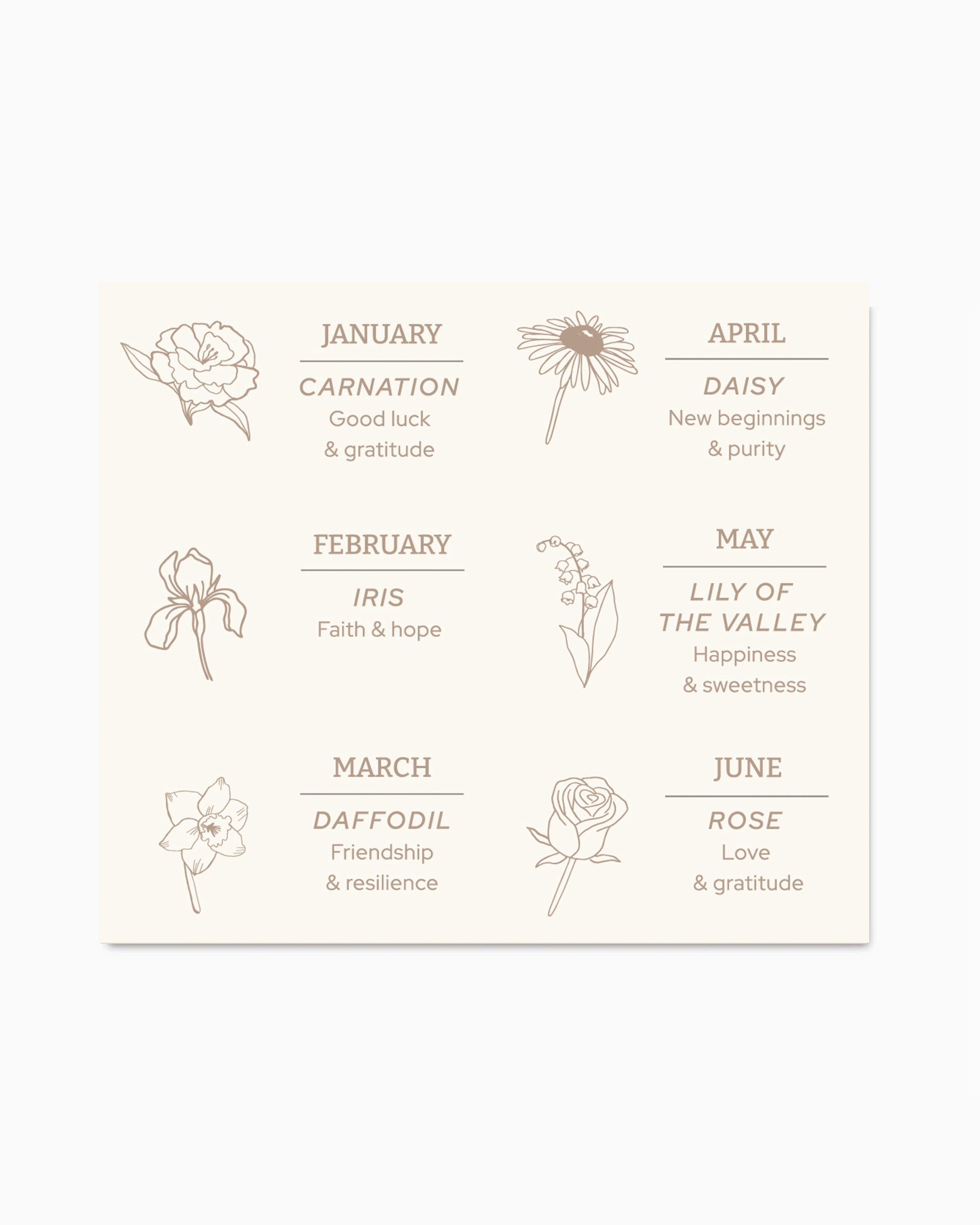Celebrate each birth month with beauty and symbolism. Add a meaningful touch to your gifts with this beautifully designed birth flower meaning card. Featuring delicate floral illustrations for each month—from January’s Carnation to December’s Holly—each flower is paired with its traditional symbolism.