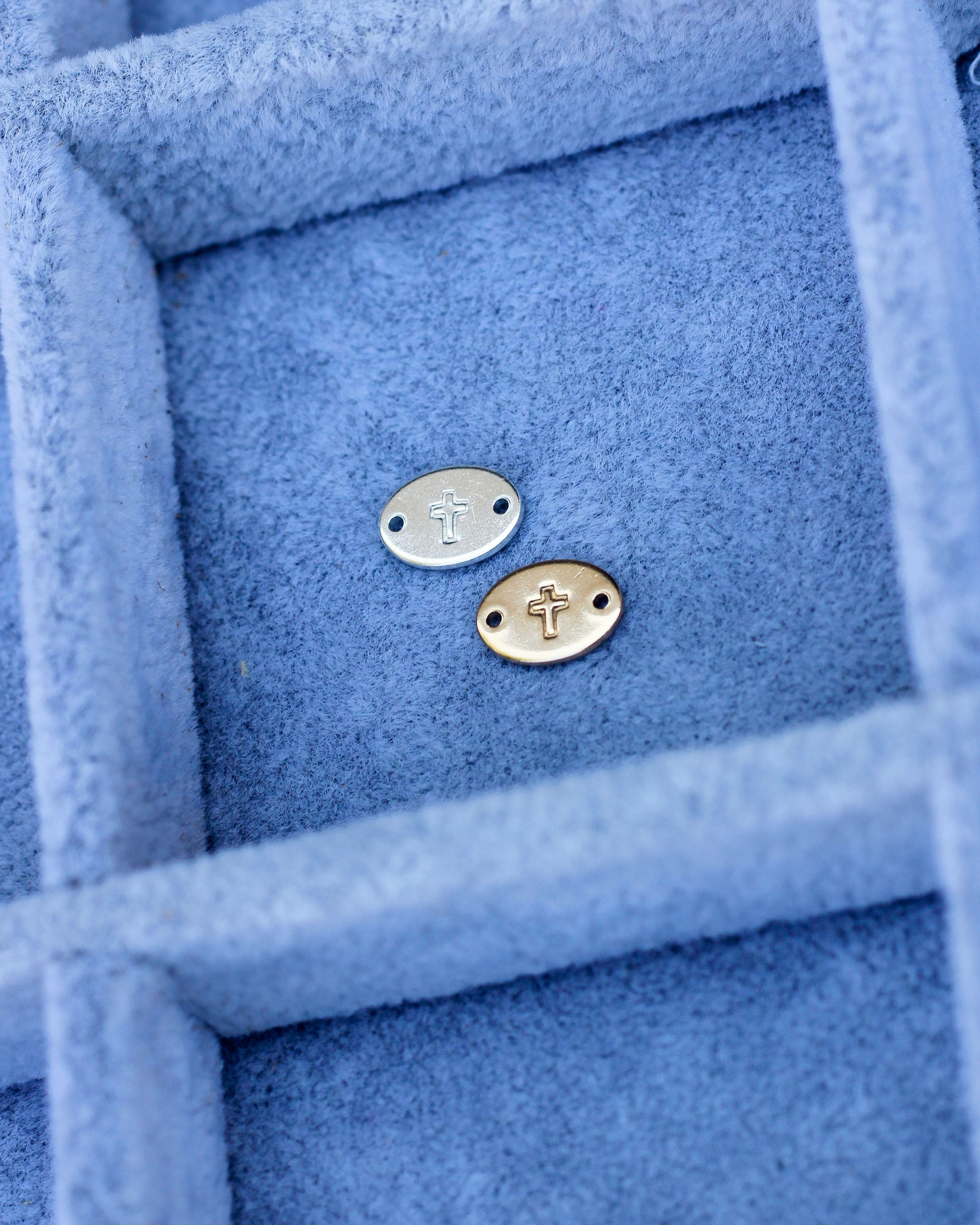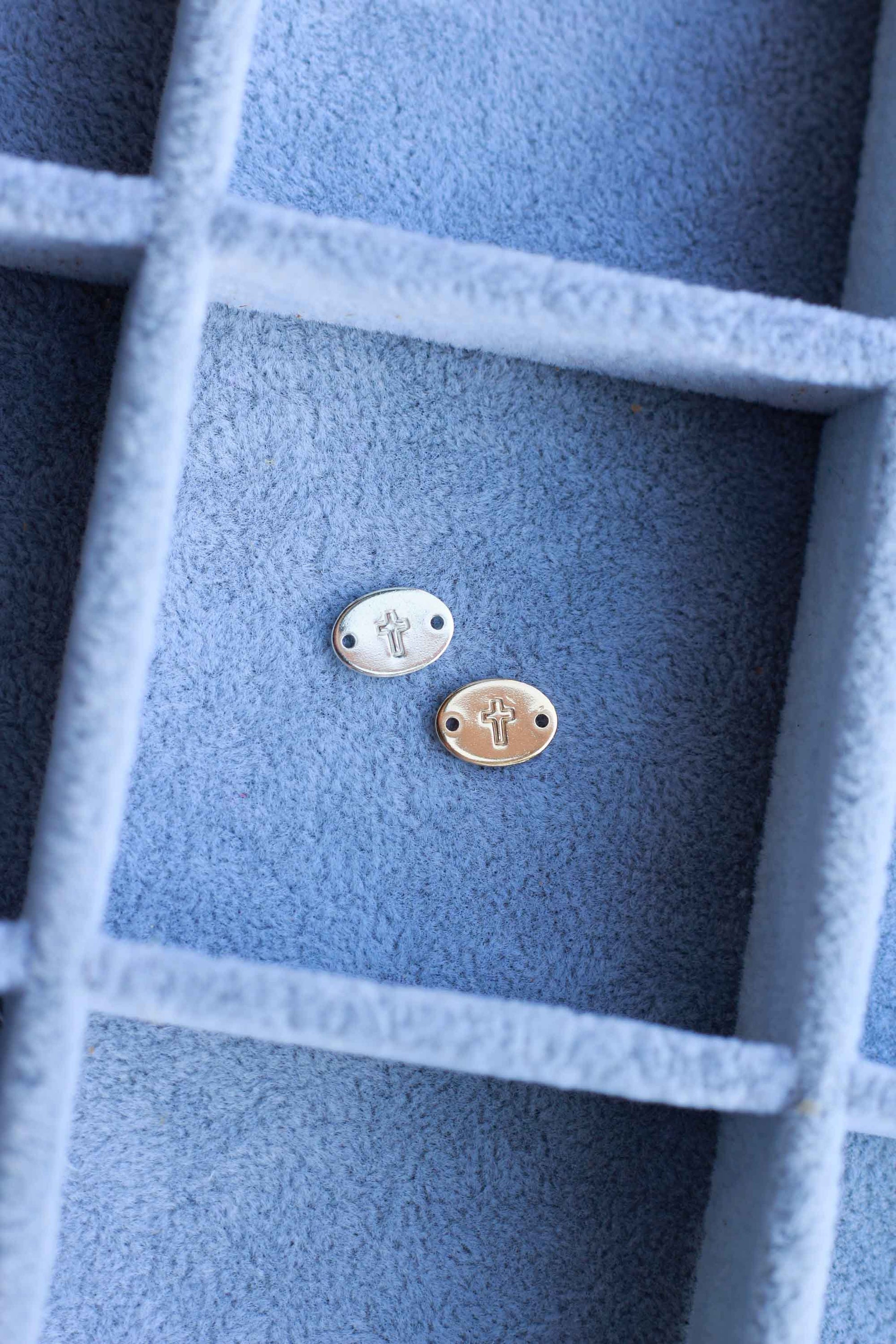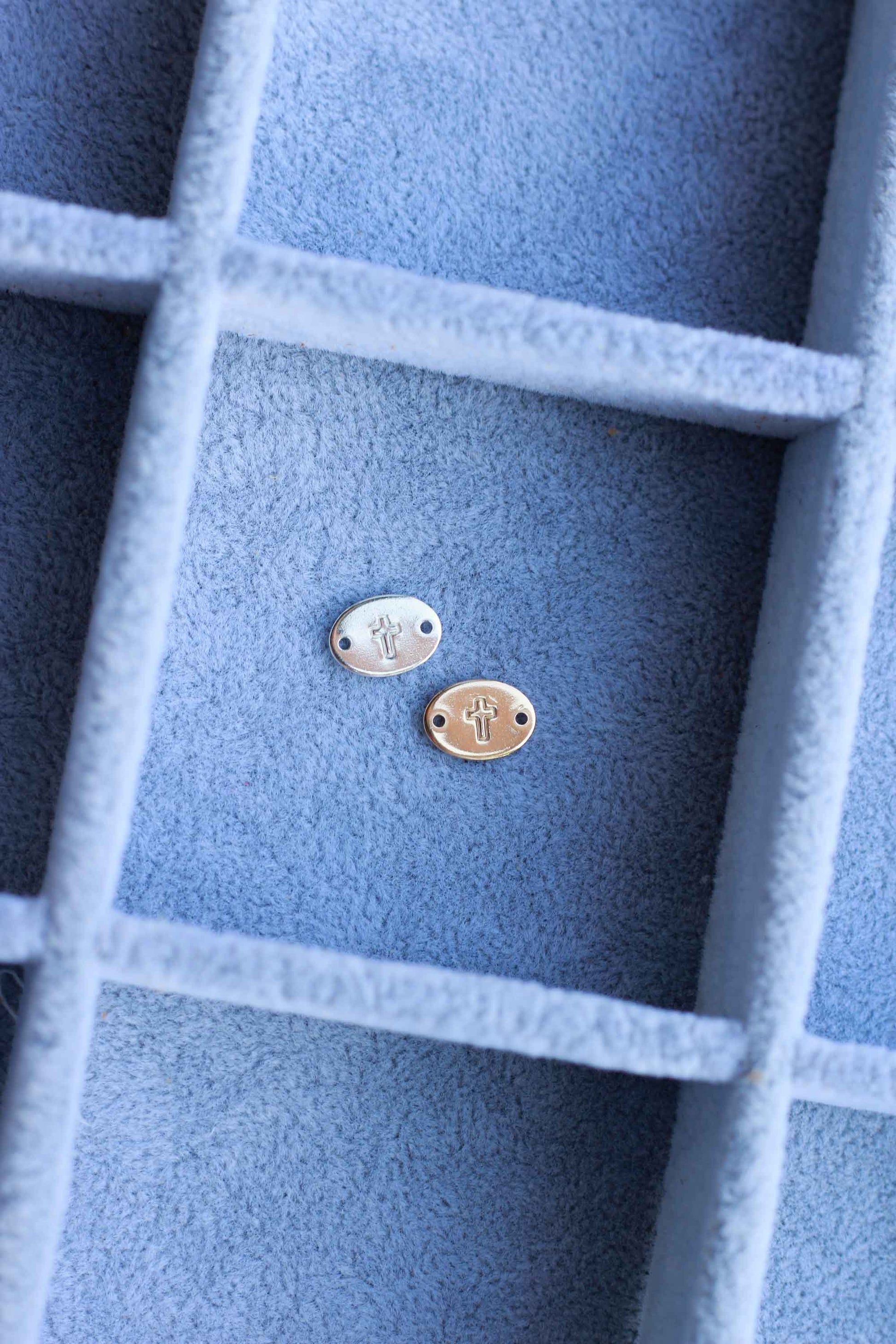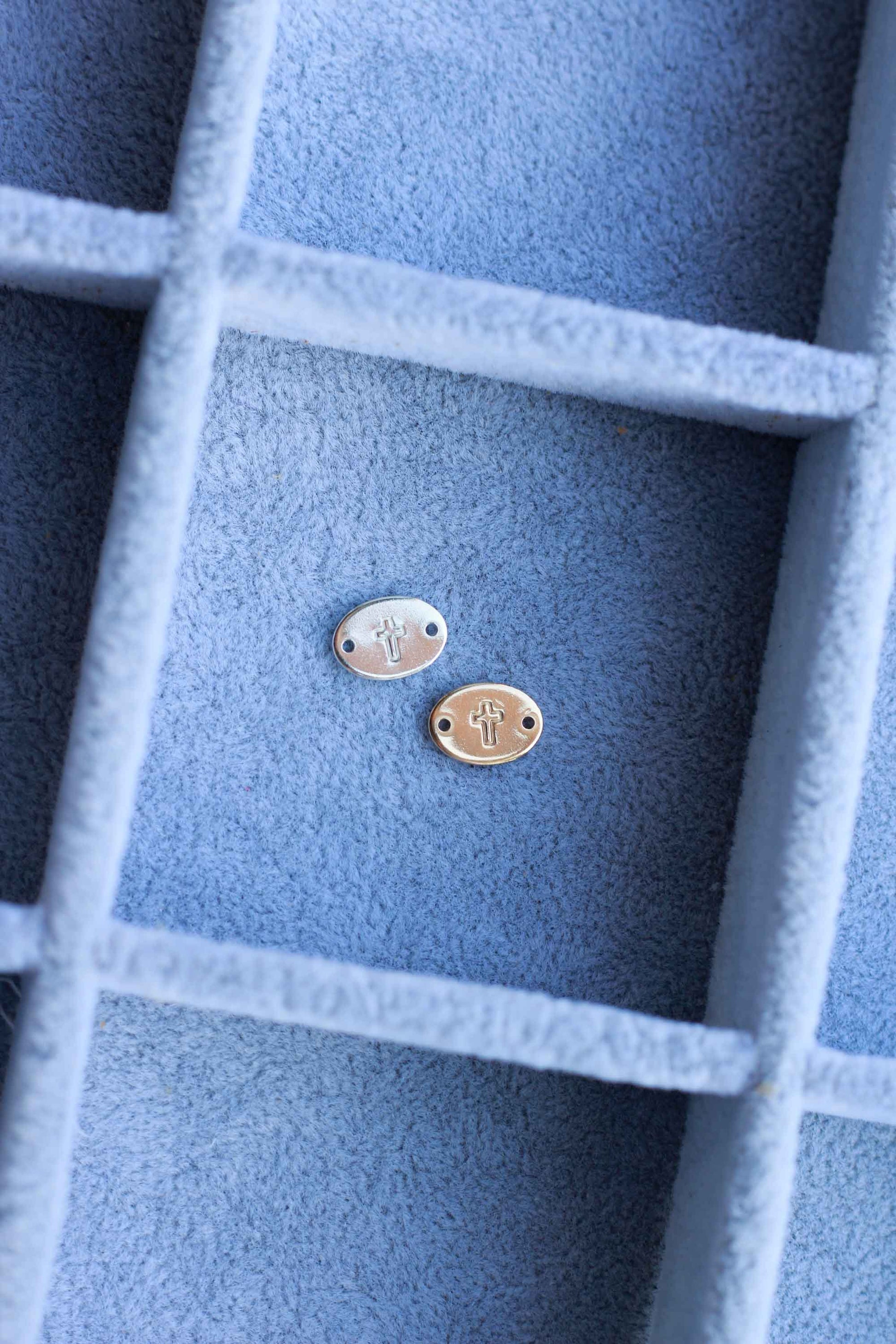 This is a hand stamped and handmade oval connector with our cross design.