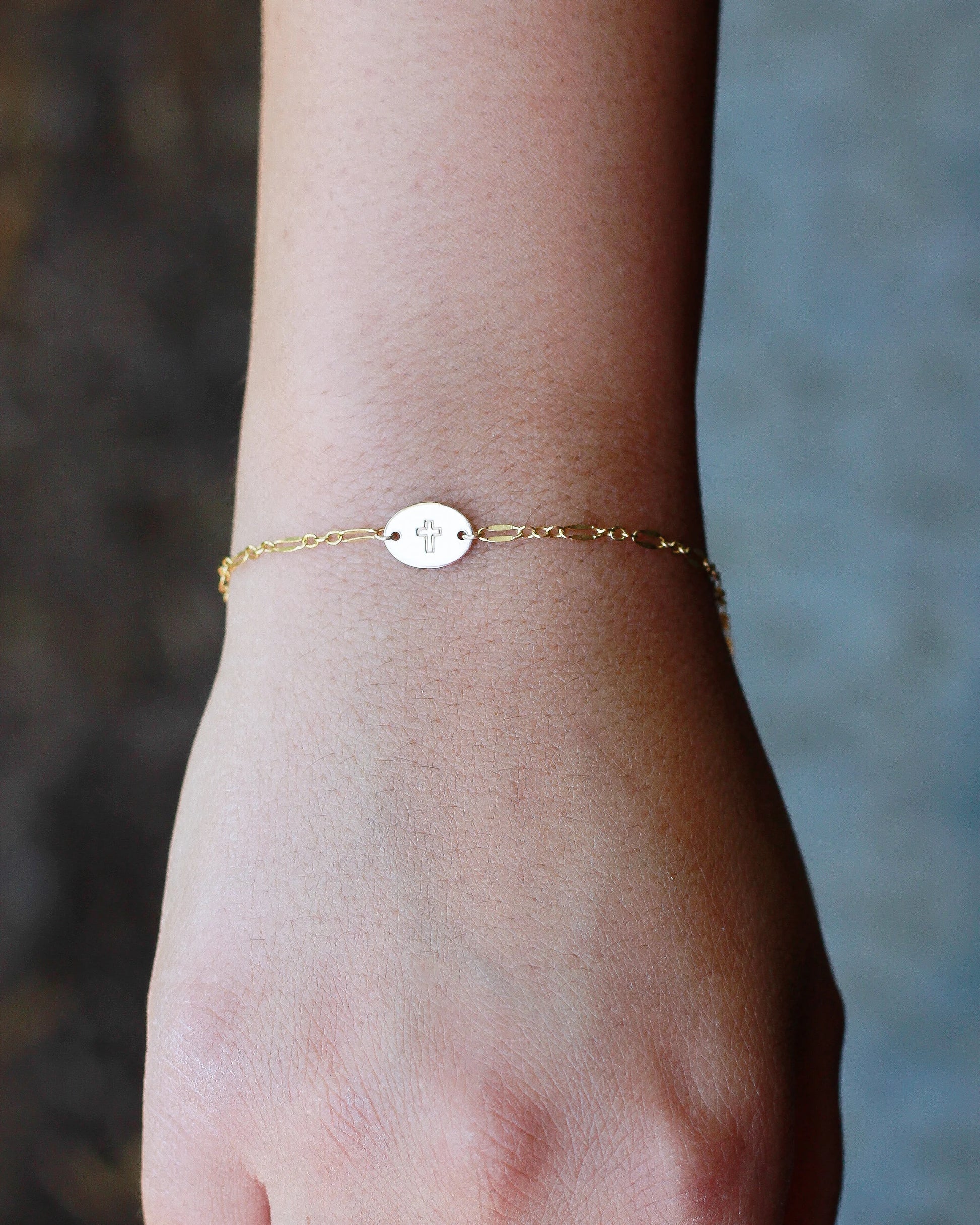 Oval connector charm hand stamped with cross